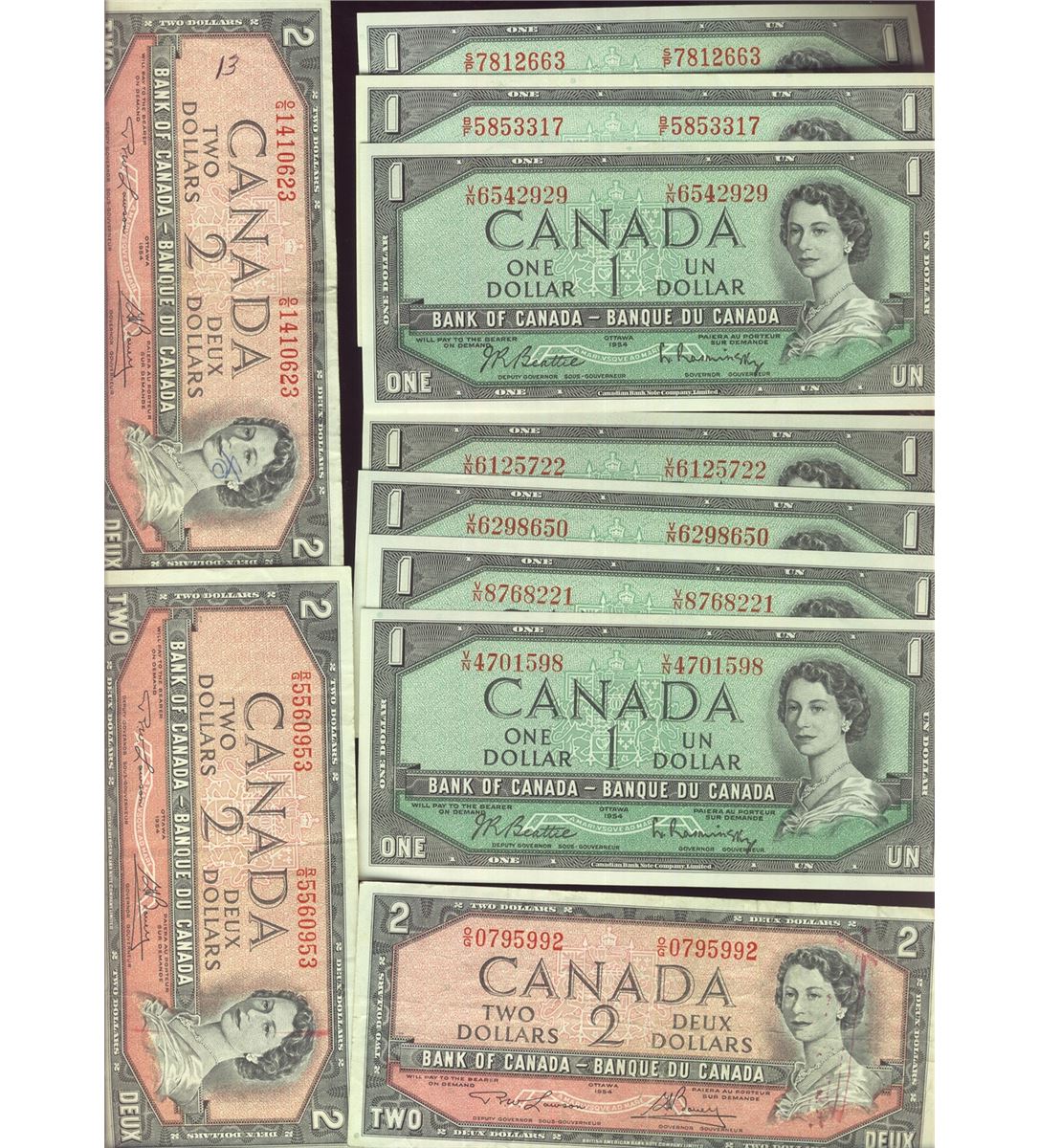 1954 $1 BC-37b(14) & $2(14). 1954 $1's crisp UNC and $2's circs to VF. Includes some consec $1 issues.