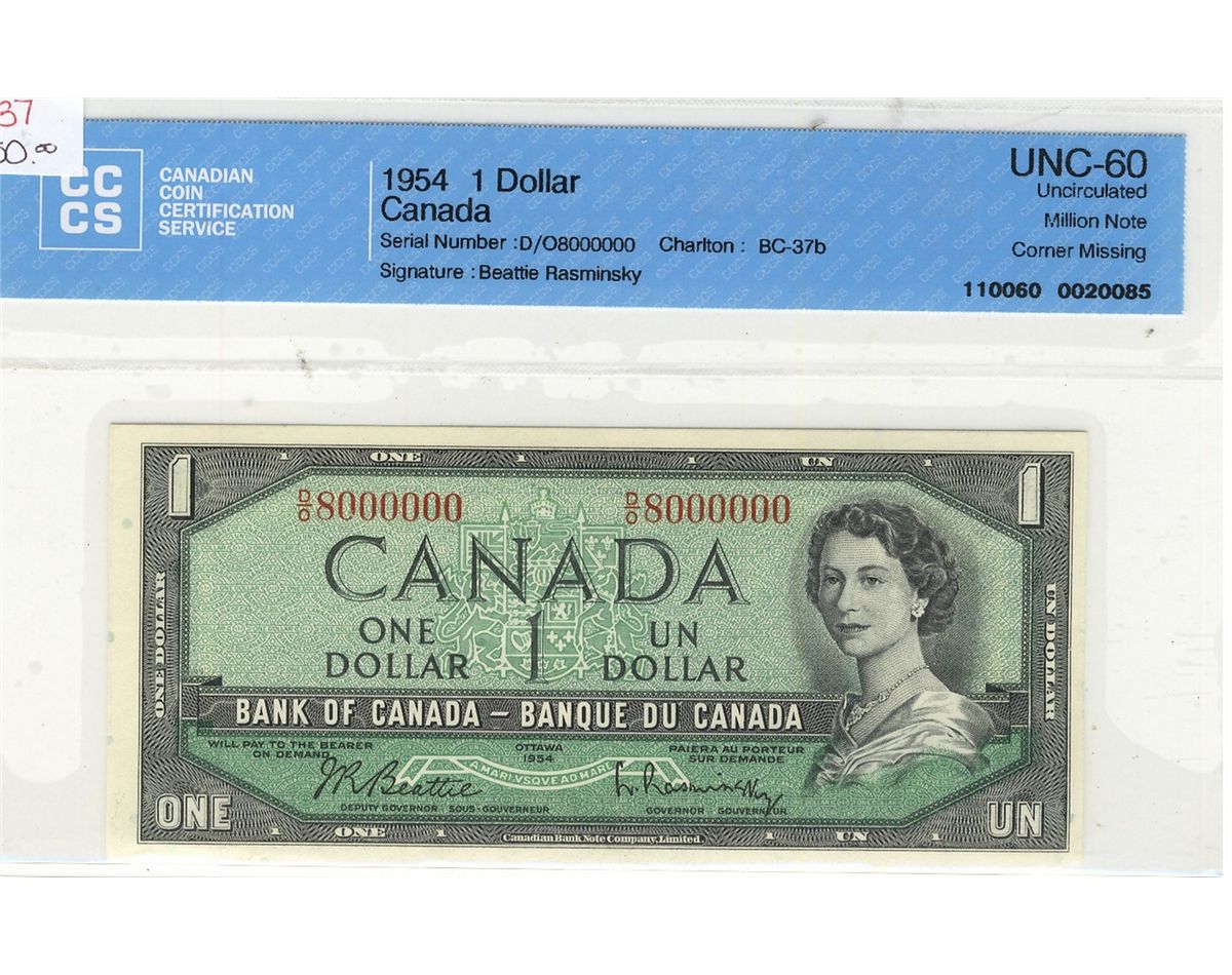 1954 $1 BC-37b 8 Million CCCS UNC-60, Corner Missing.