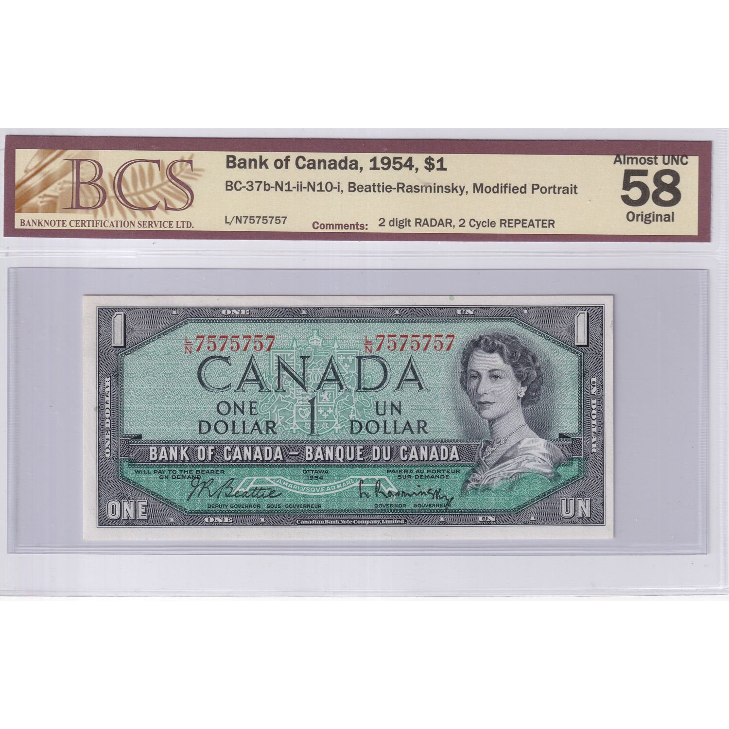 1954 $1 BC-37b-N1-ii-N10-I, Bank of Canada, Beattie-Rasminsky, S/N: L/N7575757, 2 Digit RADAR, 2 Cycle REPEATER, BCS Certified AU-58 Original