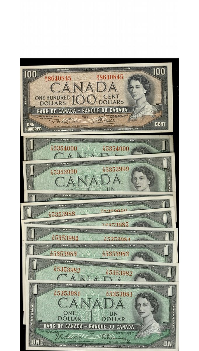 1954 $1 BC-37b #YN5353981-5354000. Lot of 20 consecutive Crisp AU/UNC issues with exception of last note of series in EF grade. Also includes $100 BC-43c #BJ8640845, AU+.
