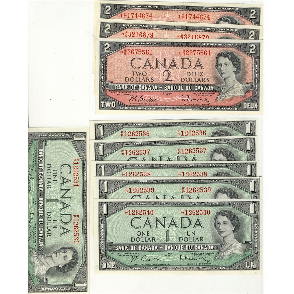 1954 $1 BC-37b-i(5), $2 BC-38cA #*AG & *BB(2). Lot of 8 notes EF to UNC.