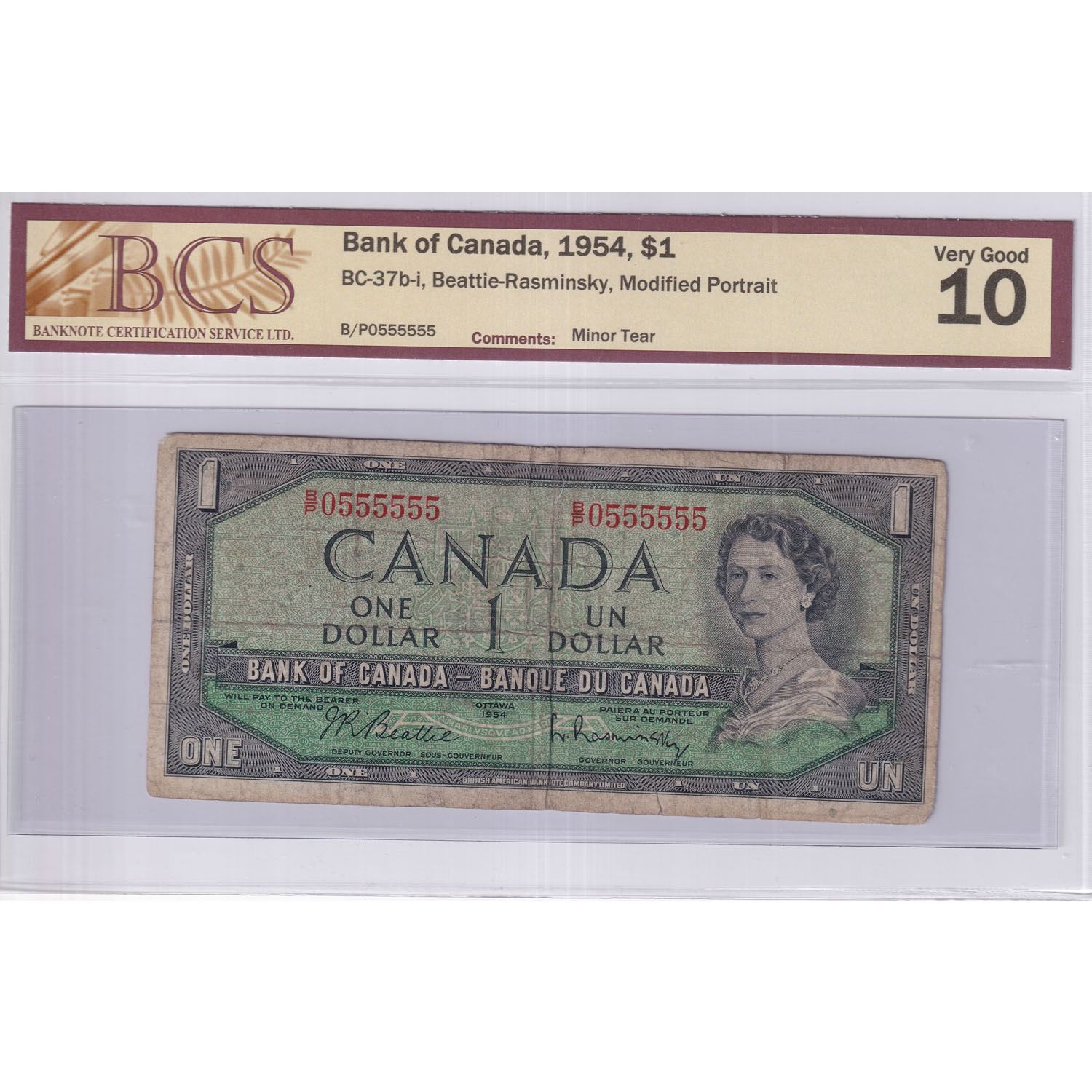 1954 $1 BC-37b-i, Bank of Canada, Beattie-Rasminsky, Modified Portrait, Neat Number, S/N: B/P0555555, BCS Certified VG-10 (Minor Tear).