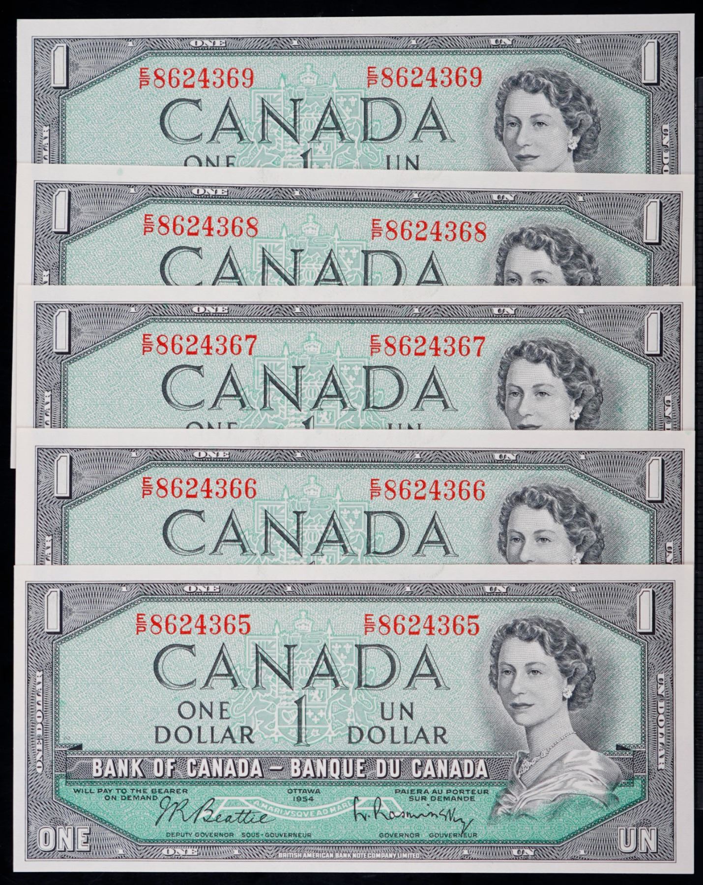 1954 $1 BC-37b-i #E/P8624365-4369. 5 Consecutive notes in Gem Uncirculated or better.