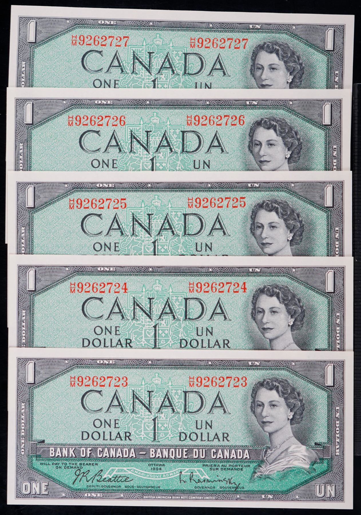 1954 $1 BC-37b-i #H/M9262723-2727. 5 Consecutive notes in Gem Uncirculated or better.
