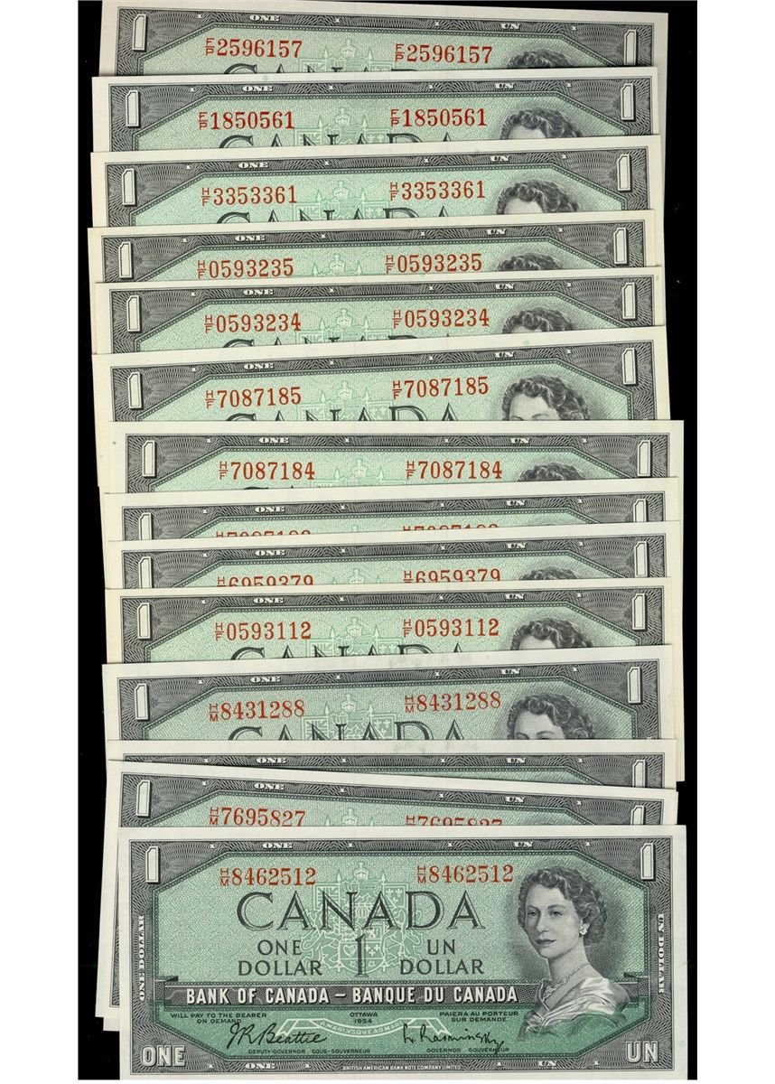 1954 $1 BC-37b-i #HM. Lot of 15 notes, some consecutive runs AU to UNC.