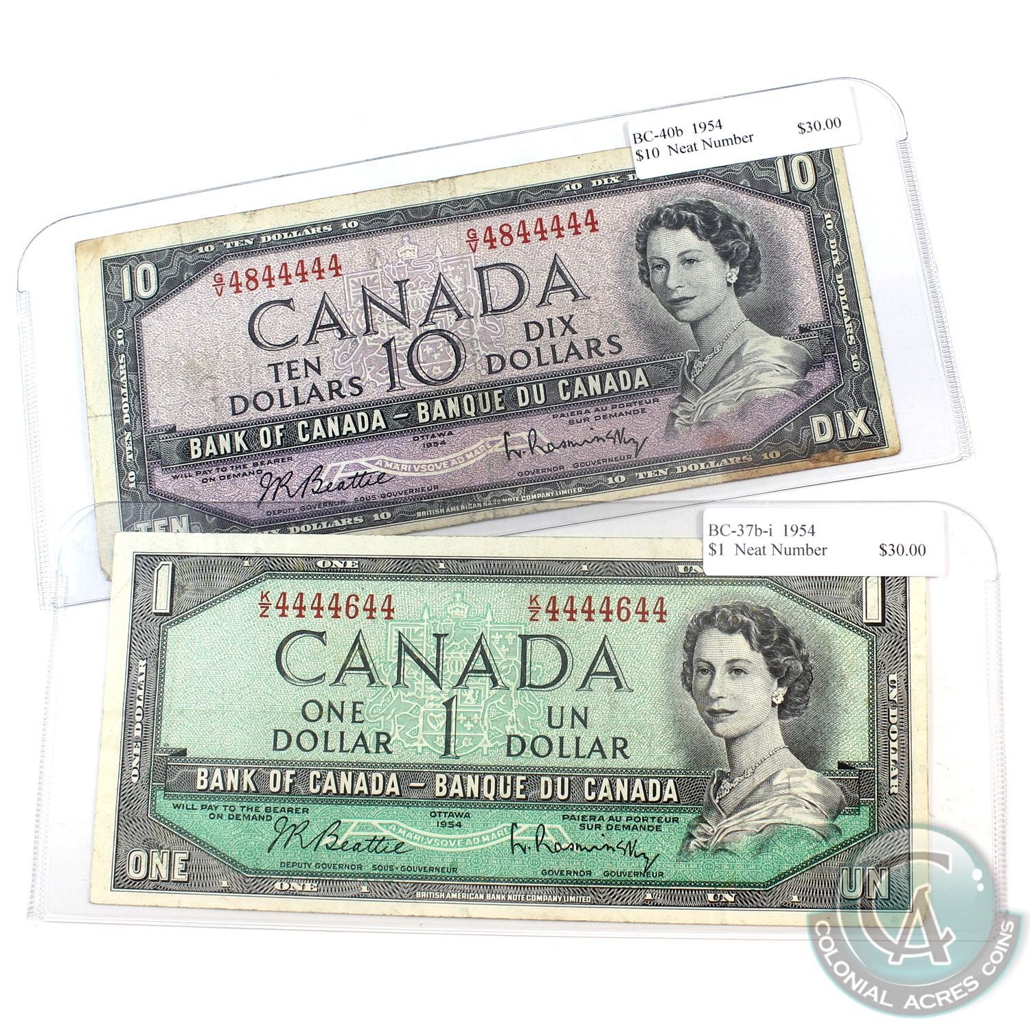1954 $1 BC-37b-i, Neat Number Serial K/Z4444644 & 1954 $10 BC-40b, Near Number Serial G/V4844444. 2pcs