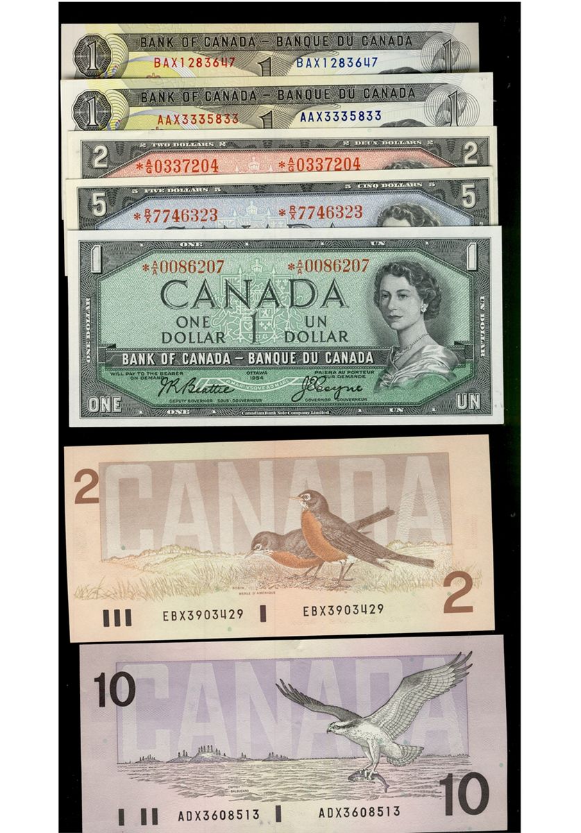 1954 $1 BC-37bA #*AA, $2 BC-38cA (Bel 0400000), $5 BC-39cA (Above). 1973 $1 BC-46bA #AAX, #BAX, 1986 $2 BC-55cAi #EBX & 1989 #ADX. Lot of 7 replacement notes VF to UNC.