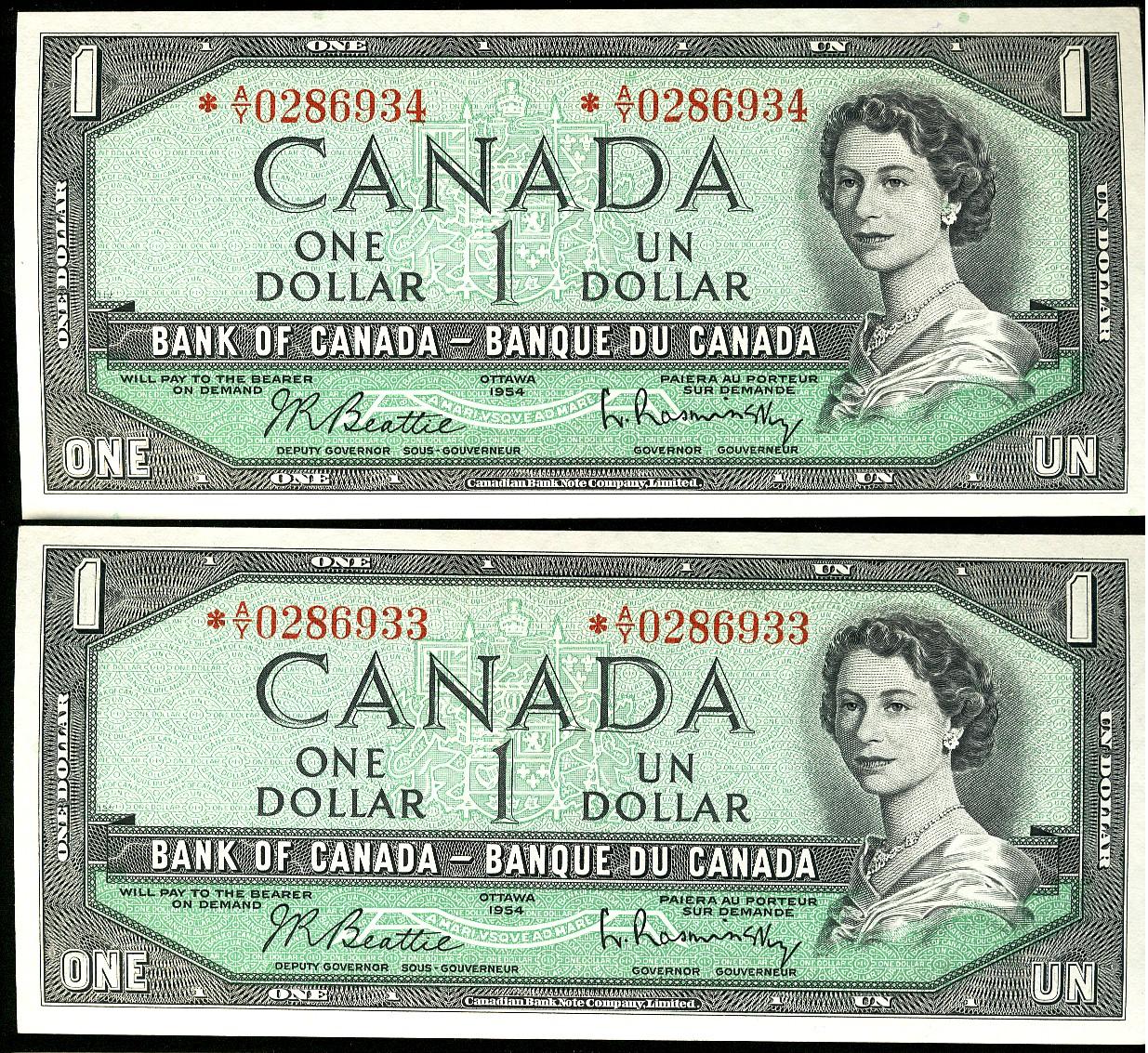 1954 $1 BC-37bA #*AY0286933/934. Lot of 2 notes consecutive. Choice UNC.