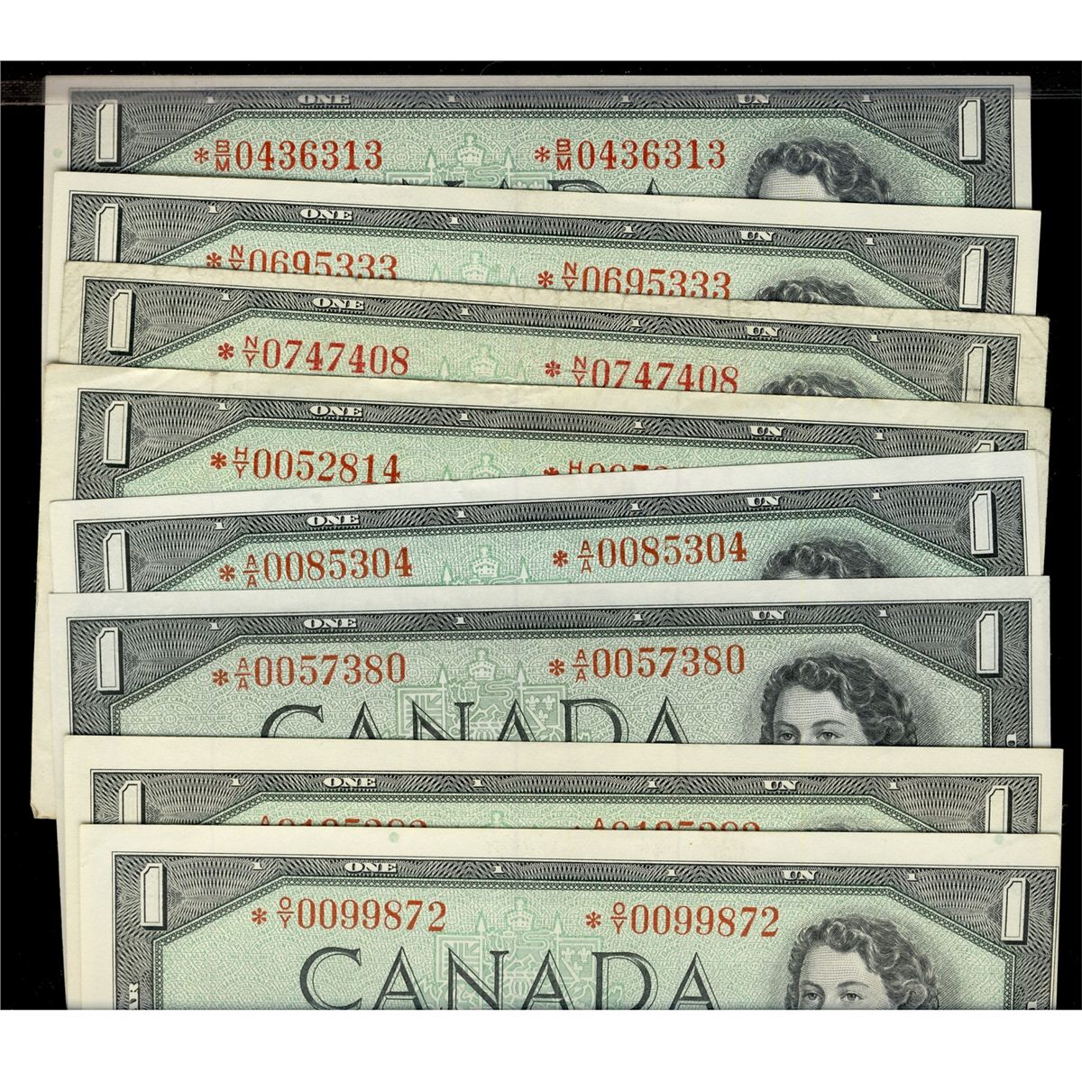 1954 $1 BC-37bA (CBN) replacement issues, #*OY, *AY, *AA(2), *NY(2) & *HY. Lot of 7 notes Fine to AU. Also includes BC-37bAi #*BM. One low grade issue shows small writing.