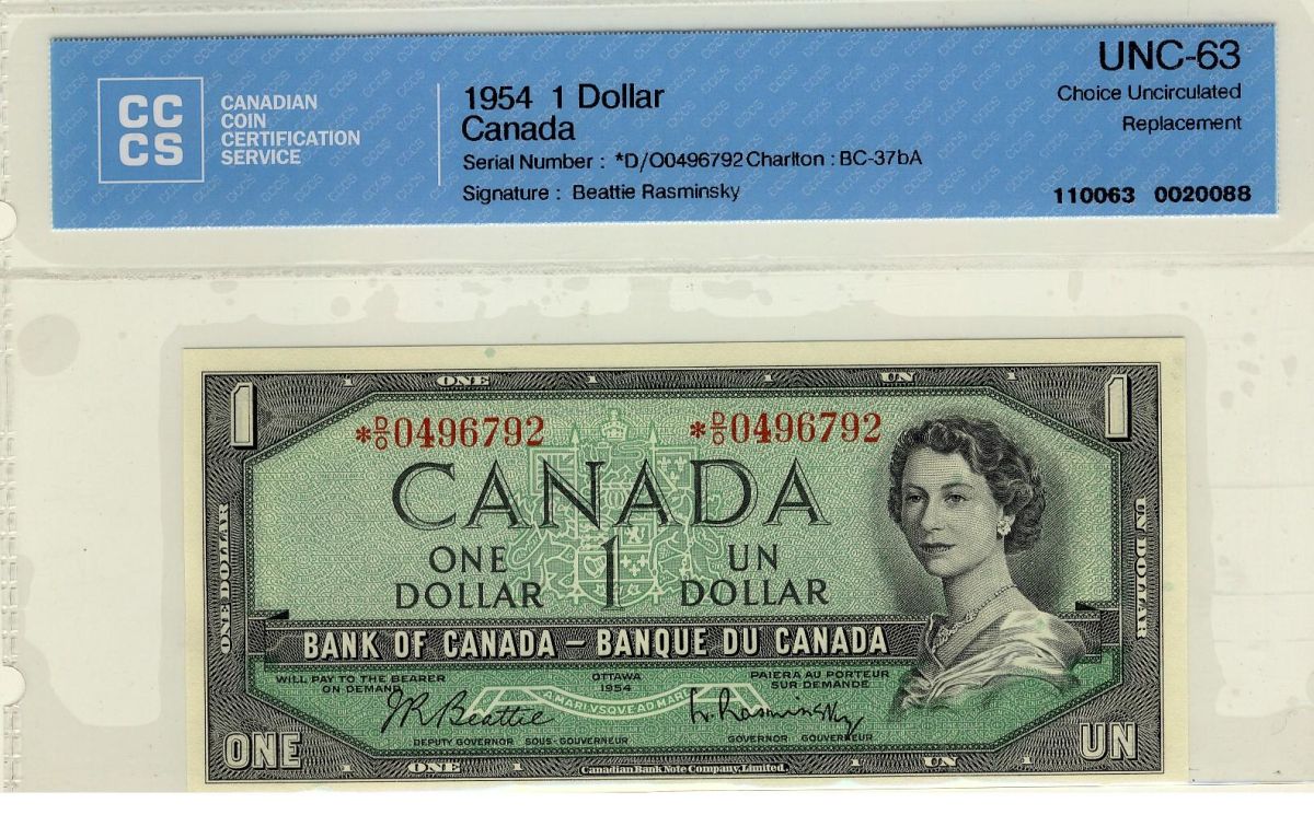 1954 $1 BC-37bA *D/O0496792 CCCS UNC63. A scarce replacement.