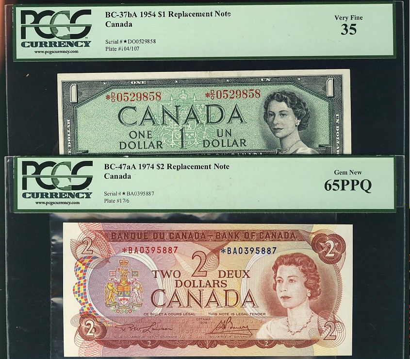 1954 $1 BC-37bA #*DO VF35 & 1974 $2 BC-47aA #*BA PCGS Gem UNC65. Lot of 2 PCGS graded notes.