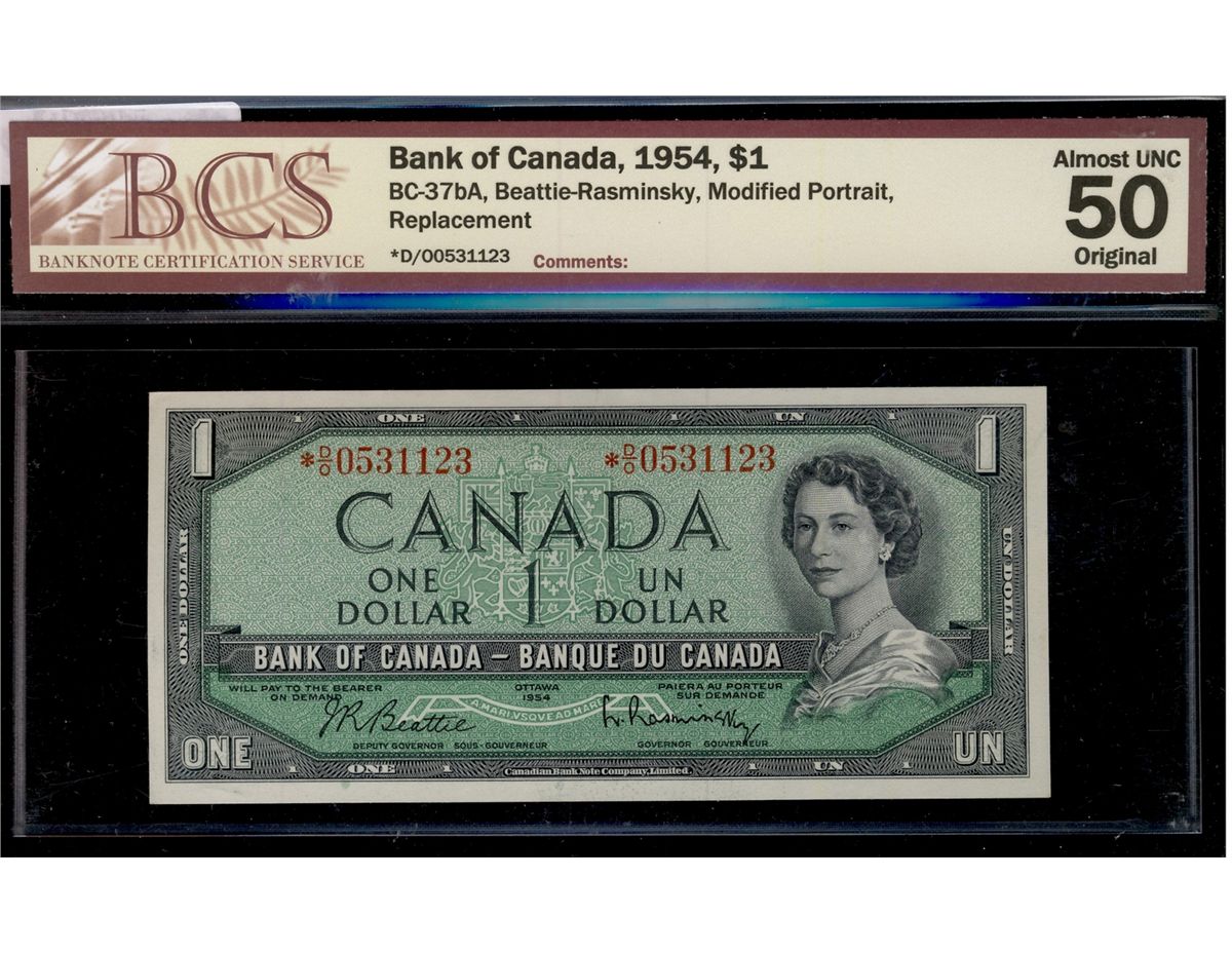 1954 $1 BC-37bA #*DO0531123, BCS AU50.