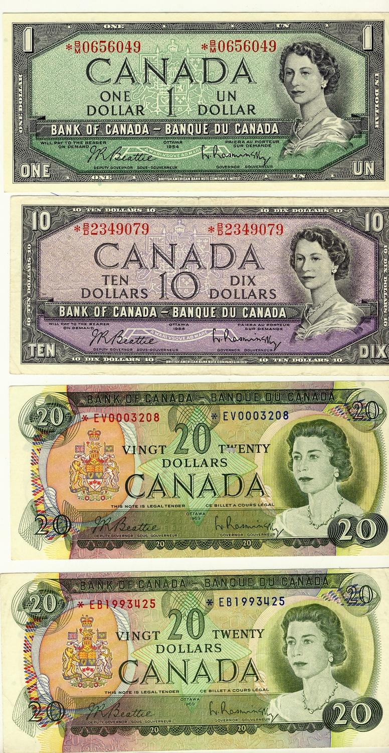1954 $1 BC-37bA-i #*BM0656049, $10 BC-40bA #*BD2349079, 1969 $20 BC-50aA *EV0003208 & BC-50aA *EB1993425. Lot of 4 replacement notes. VF to AU.