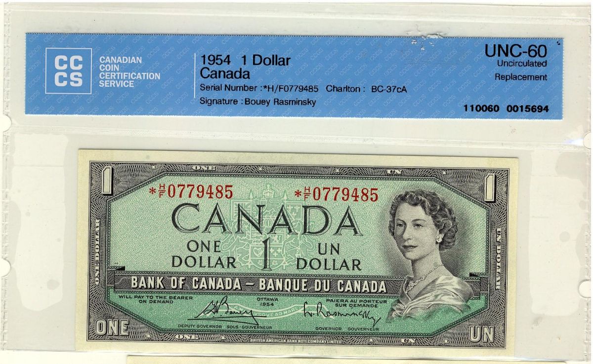 1954 $1 BC-37cA *H/F0779485 CCCS UNC60. Another better replacement.