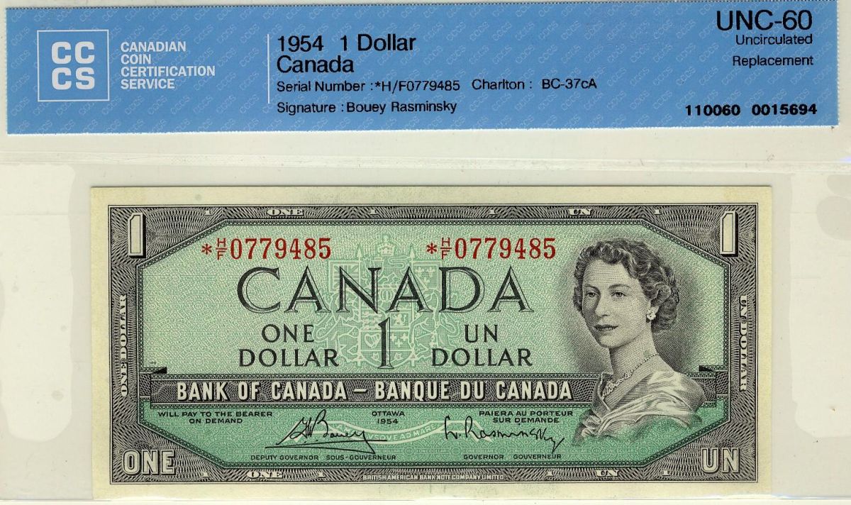 1954 $1 BC-37cA *H/F0779485 CCCS UNC60. Another better replacement.