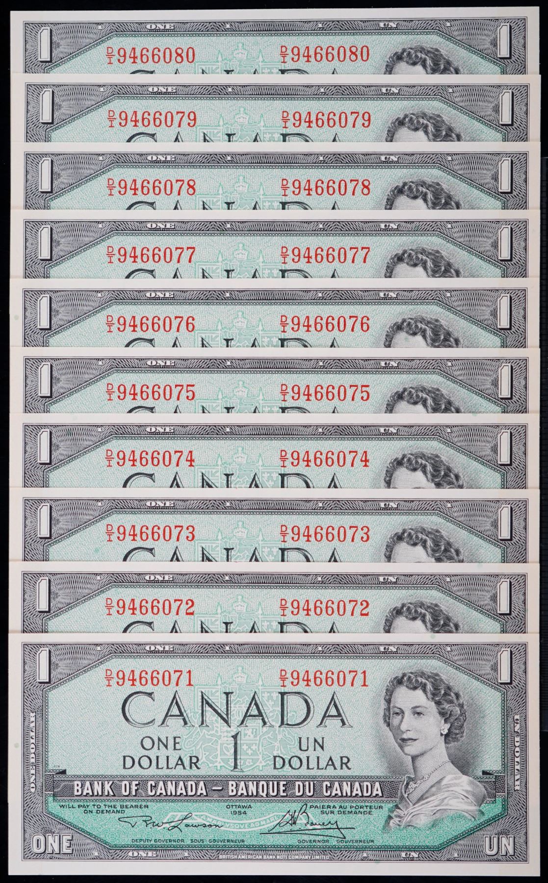 1954 $1 BC-37d #D/I9466071-6080. 10 Consecutive notes in Gem Uncirculated or better.
