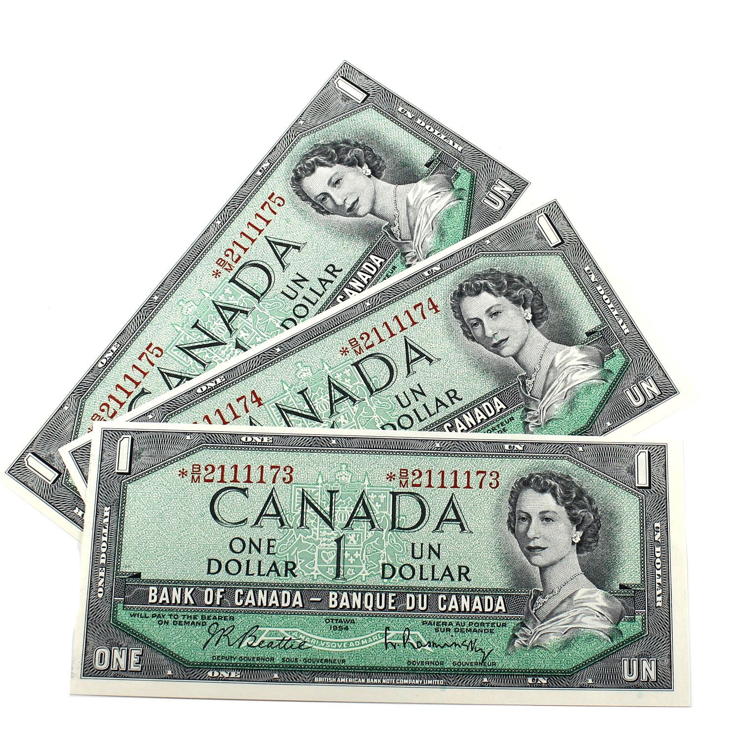 1954 $1 Bank of Canada Beattie-Rasminsky Signature Notes with Consecutive Serial Numbers *B/M2111173-75. 3pcs