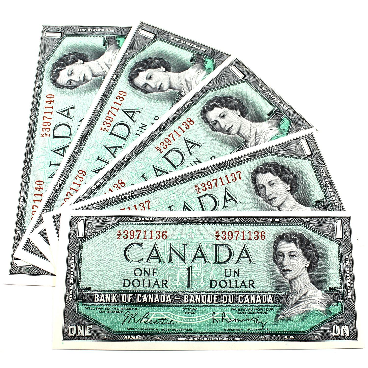 1954 $1 Bank of Canada Beattie-Rasminsky Signature Notes with Consecutive Serial Numbers K/Z3971136-K/Z3971140. 5pcs