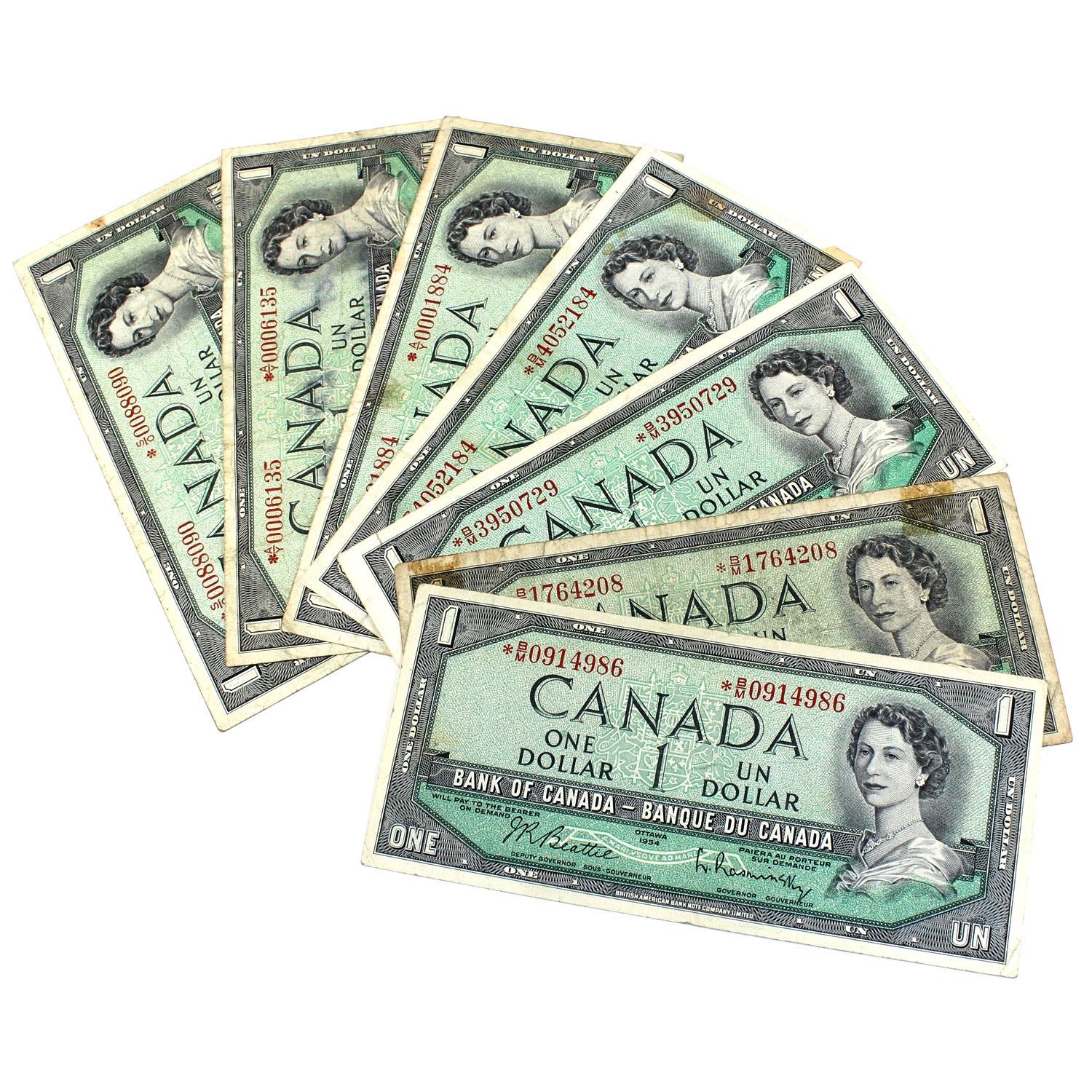 1954 $1 Bank of Canada Modified Portrait Replacement Notes with Beattie-Rasminsky Signatures - Prefixes 4x *B/M, 2x *A/Y & S/O. Notes contain various impairments. 5pcs