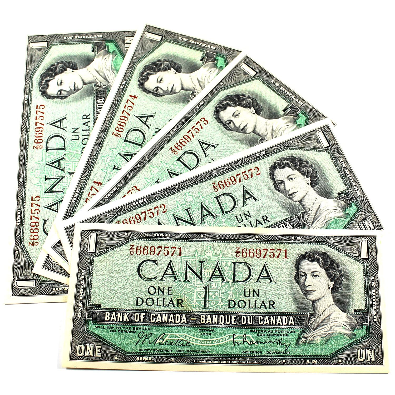 1954 $1 Bank of Canada Notes Beattie-Rasminsky Signature with Consecutive Serial Numbers Z/O6697571-Z/O6697575 UNC+. 5pcs