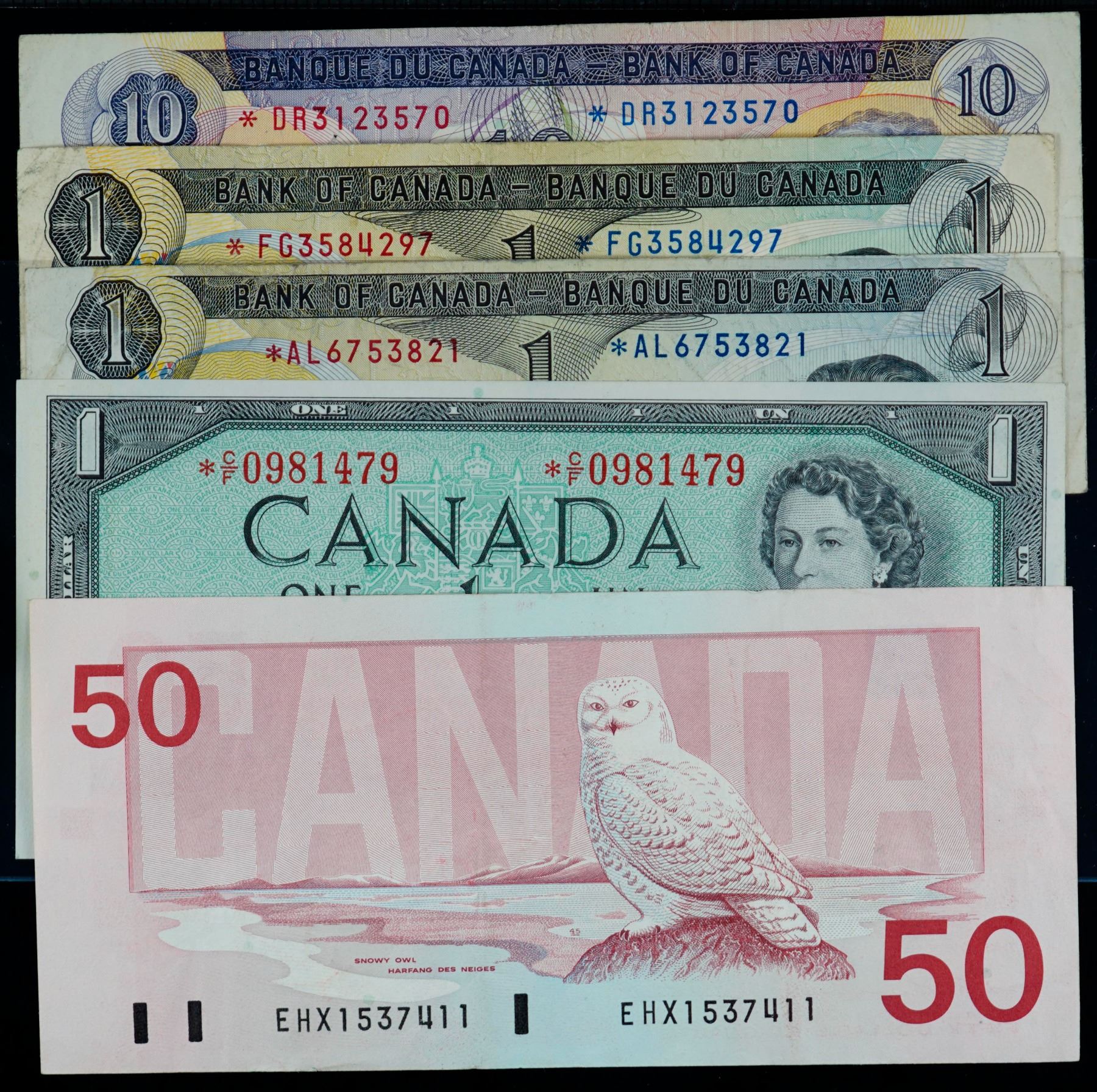 1954 $1 *C/F, 1973 $1 *AL, *FG, 1971 $10 *DR, 1988 $50 EHX Lot of 5 replacement notes. VF or better.