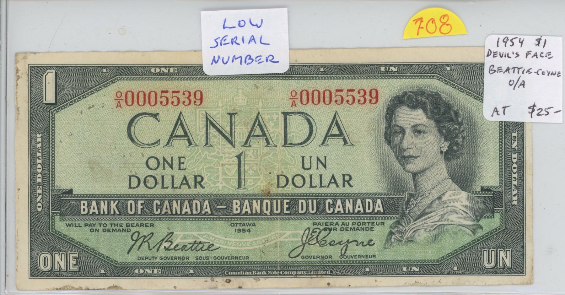 1954 $1 Devil’s Face Beattie-Coyne signatures. Low Serial Number: O/A0005539. VF-20.