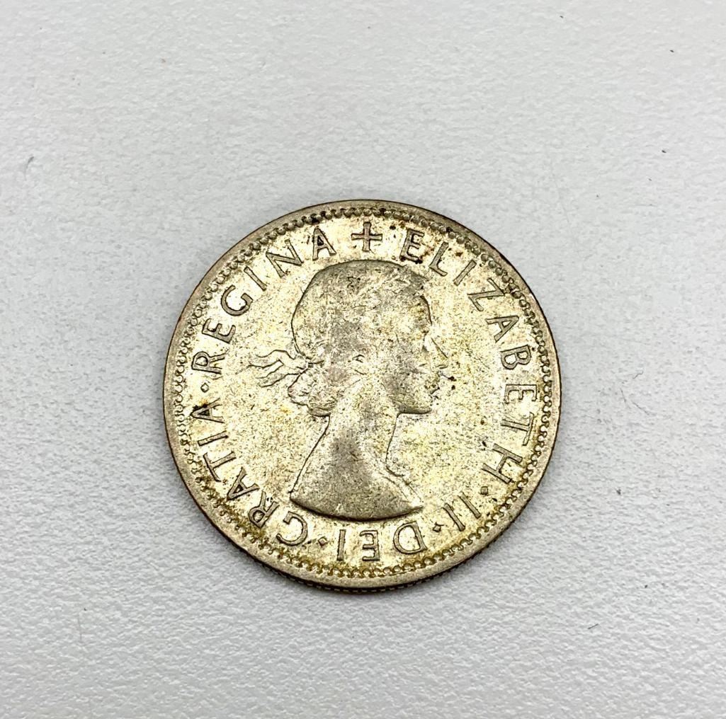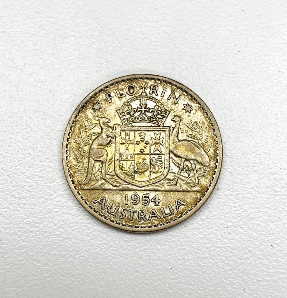 Obverse 1st portrait of Queen Elizabeth II facing right wearing a laurel Lettering: + ELIZABETH·II·DEI·GRATIA REGINA Translation: Elizabeth II by the Grace of God, Queen Engraver: Mary Gillick Reverse Coat of arms Lettering: *FLO RIN* K·G 1953 AUSTRALIA Engraver: George Kruger Gray Specifications CountryAustralia Queen: Elizabeth II (1952-date) Type: Standard circulation coin Years: 1953-1954 Value: 1 Florin = 2 Shillings (0.1) Currency: Pound (1910-1966) Composition: Silver (.500) Weight: 11.31 g Diameter: 28.5 mm Thickness: 2.2 mm Shape: Round