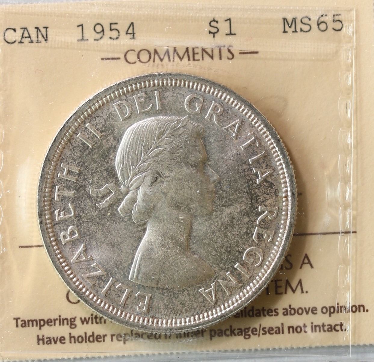 1954 $1 ICCS Gem Mint State-65. Lustrous with delicate gold and russet tones throuhout the coin.