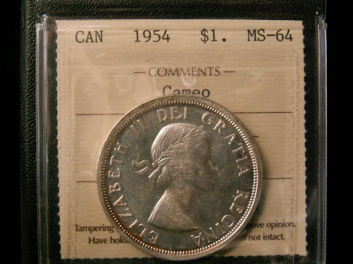 1954 $1 ICCS MS64 Cameo. Mostly white and fully lustrous.