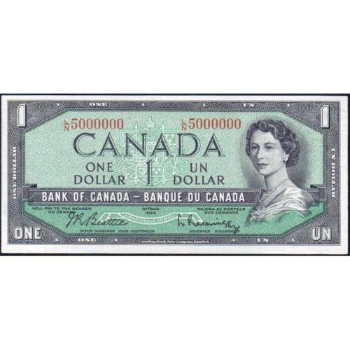 1954 One Dollar Beattie-Rasminsky, BC-37b Million Serial Number L/N5000000, PMG Gem Uncirculated 65 Exceptional Paper Quality