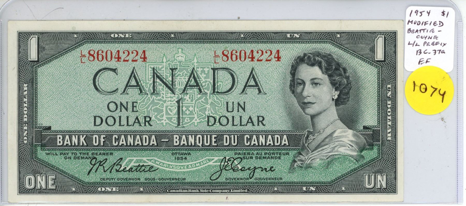 1954 $1 Modified Portrait. Beattie-Coyne signatures. L/L Prefix. BC-37a. EF-40.