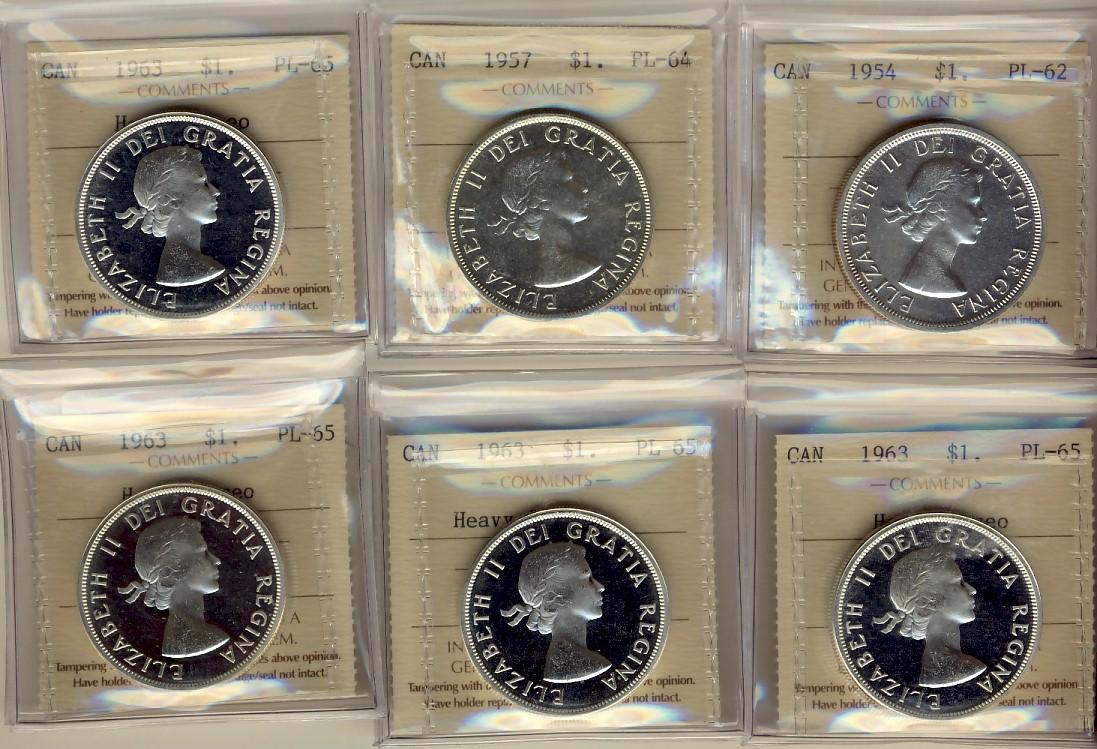 1954 $1 PL62, 1957 PL64 & 1963 PL65 Heavy Cameo(4). Lot of 6 ICCS graded coins.