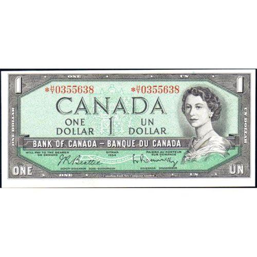 1954 One Dollar Beattie-Rasminsky Replacement Note, BC-37bA Serial Number *H/Y0355638, Uncirculated. Off centre toward the top and right