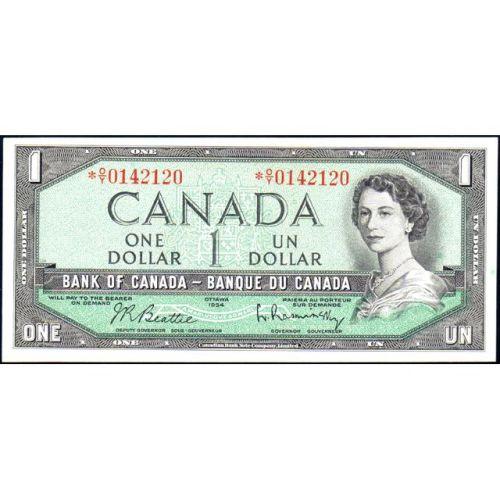 1954 One Dollar Beattie-Rasminsky Replacement Note, BC-37bA Serial Number *O/Y0142120, Uncirculated. Slightly bias cut