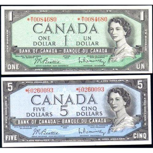 1954 One Dollar Beattie-Rasminsky Replacement Note, BC-37bA Serial Number *M/Y0084680, EF and 1954 Five Dollars Beattie-Rasminsky Replacement Note, BC-39bA Serial Number *V/S0260093, AU