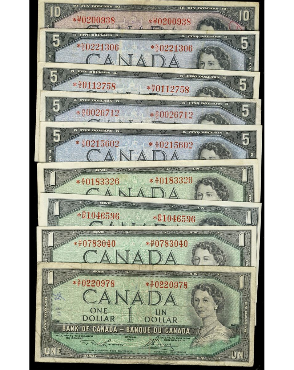 1954 $1 #*XF, *HF, *AY, *BM, $5 BC-39bA Replacement issues #*VS, *RC, *NS, *NX, *NS & $10 BC-40bA #*UT. A nice lot of 9 replacement notes, come better prefixes and som with issuesé Fine to VF+. Catalogue value approx $600. Shoud be viewed.