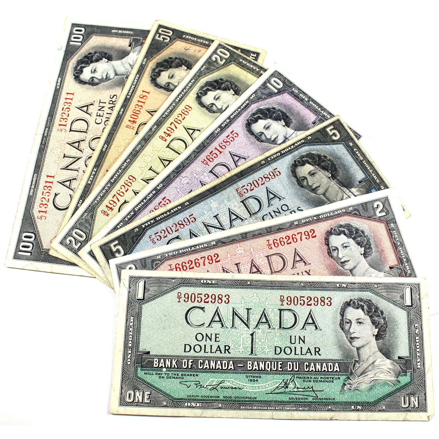 1954 $1 to $100 Bank of Canada Notes. You will receive Lawson-Bouey signatures on the $1, $2, and $100 notes, and Beattie-Rasminsky signatures on the $5, $10, $20, and $50 notes. Notes may have some writing or ink on them. 7pcs