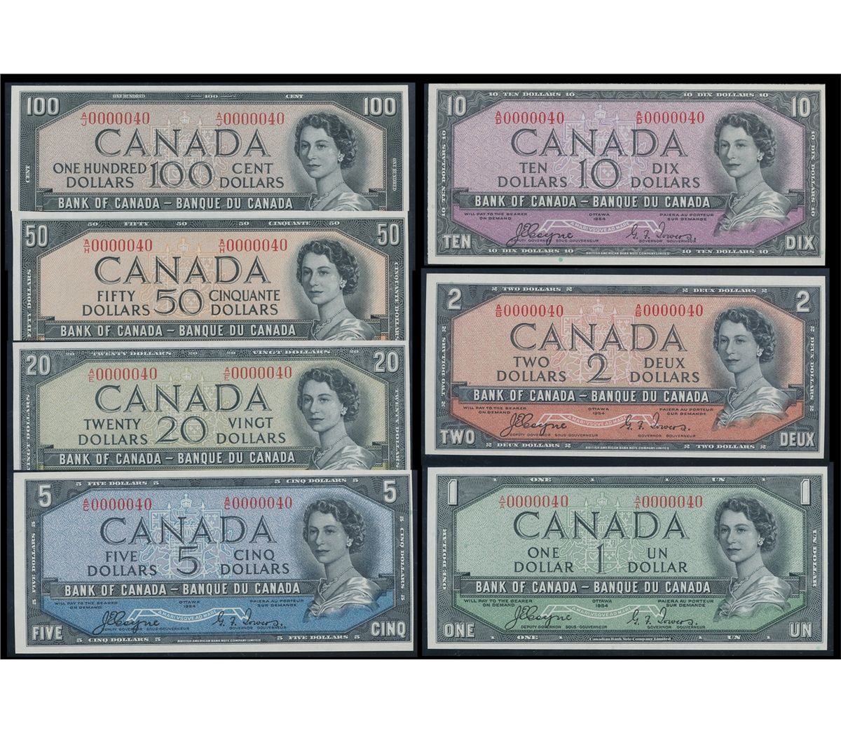 1954 $1 to $100 Devils Face Low Serial Number Set #0000040. Coyne-Towers Signatures all PMG CH UNC63 to Gem UNC65EPQ.