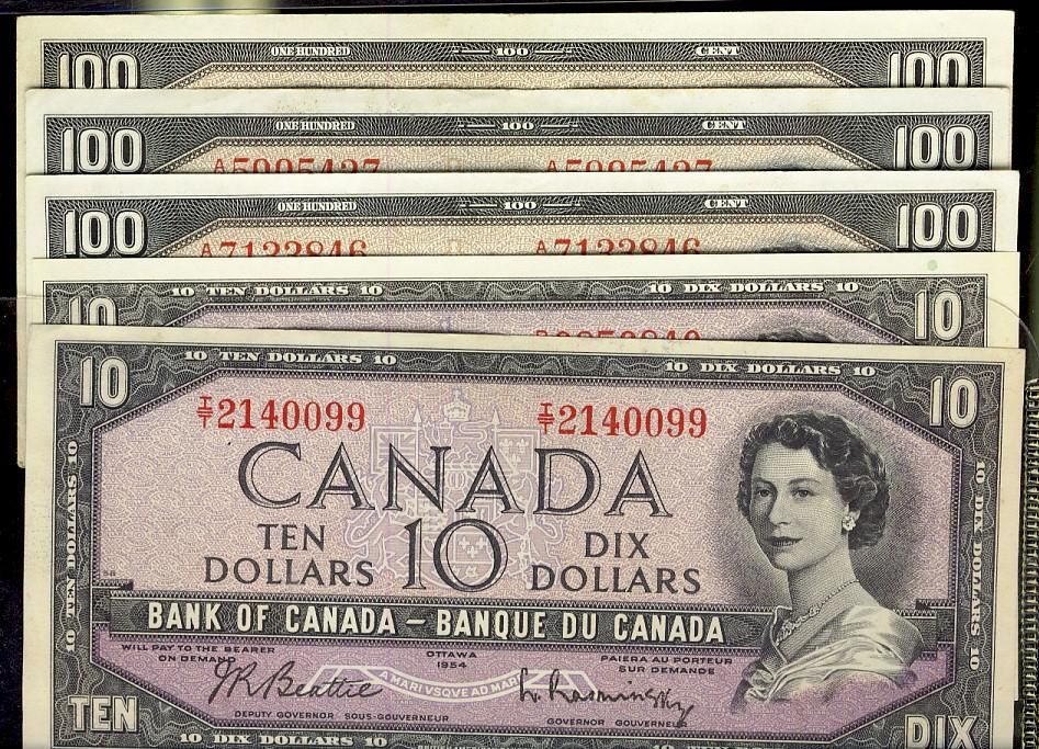 1954 $1 to $100. Lot of 5 notes including $10(2) and $100(3). VF to EF+. (Face value $320).