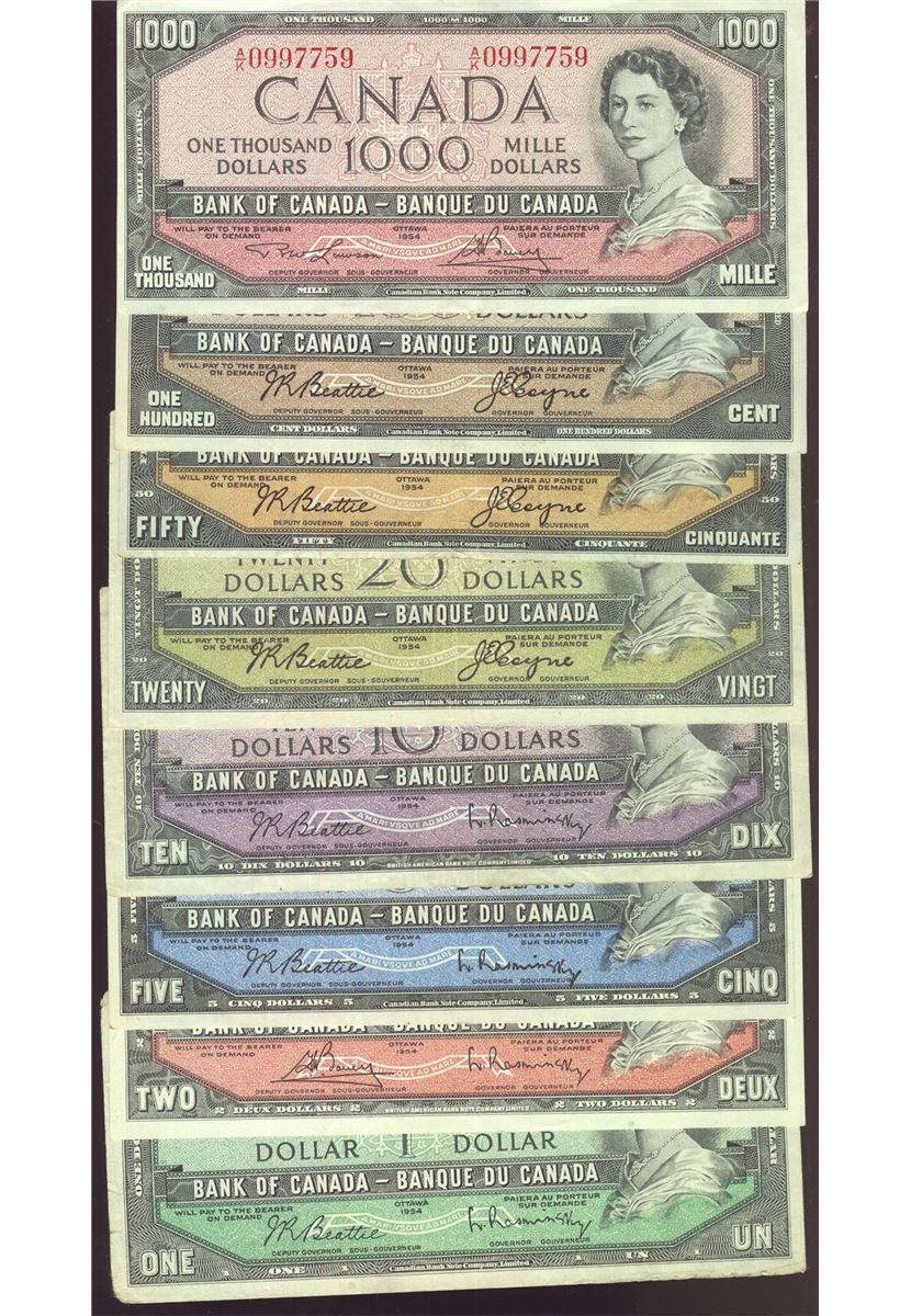 1954 $1 to $1000. Lot of 8 modified notes average VF-EF.