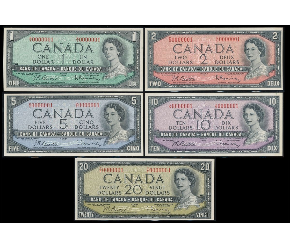 1954 $1 to $20 Rare Serial #0000001 Set. Lot of Crisp Original AU/UNC issues. Beattie-Raminsky signature set includes $1, $2, $5, $10 & $20. Never before handled as a set.