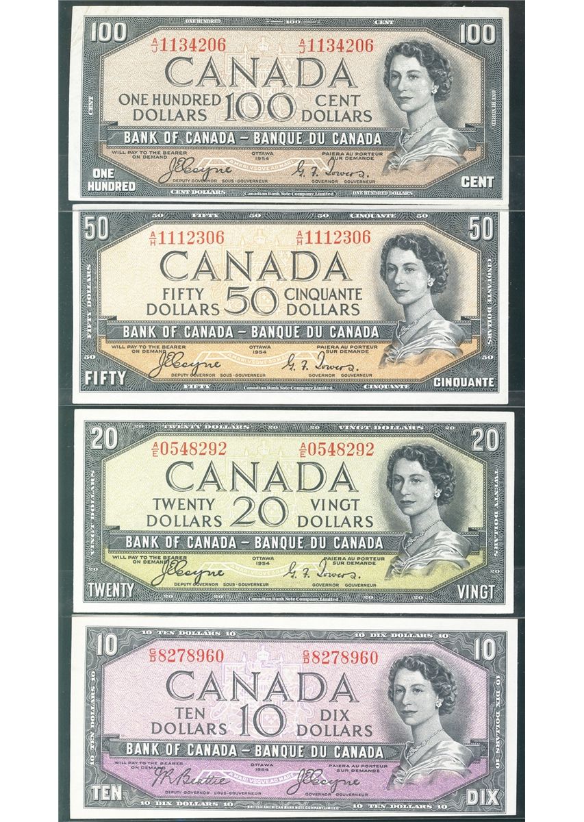 1954 $10 BC-32b, $20 BC-33a, $50 BC-34a & $100 BC-35a. Lot of 4 Devil Face notes VF30 to EF+. Lightly pressed.