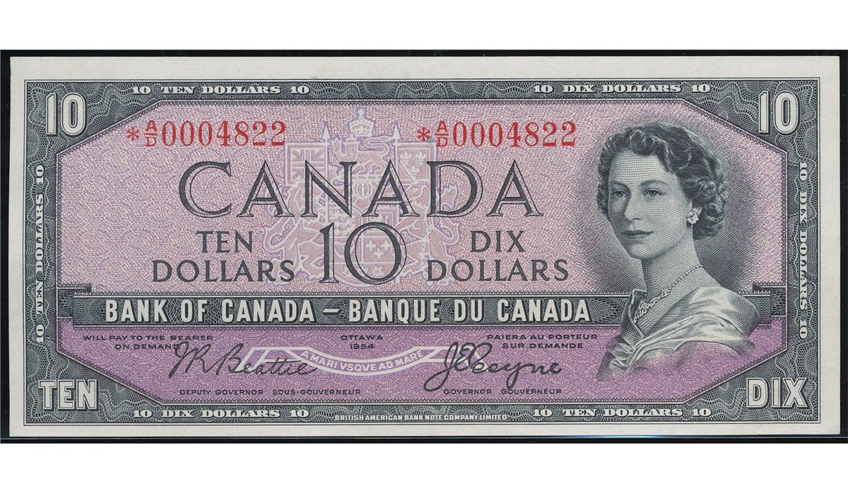 1954 $10 BC-32bA #*0004822. Rare $10 DF replacement issue. A sharp AU+ issue.