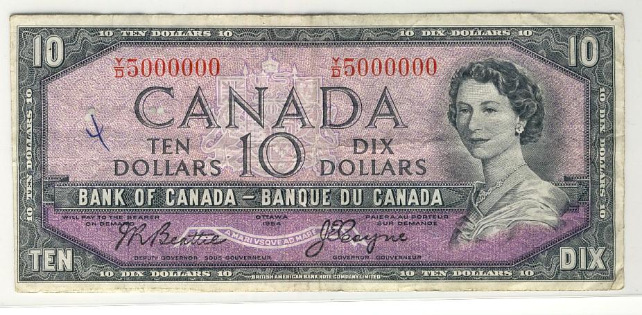 1954 $10 BC-40a SOLID #5000000. Rare issue in VF grade. Small 4 written on front.