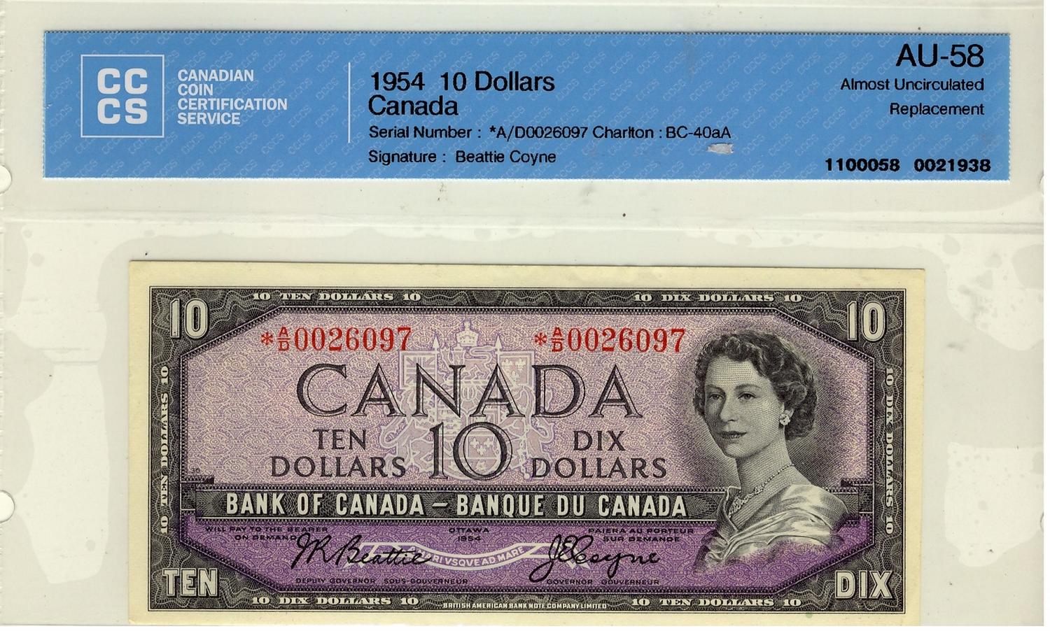 1954 $10 BC-40aA *A/D0026097 CCCS AU58. Bright and looks choice.