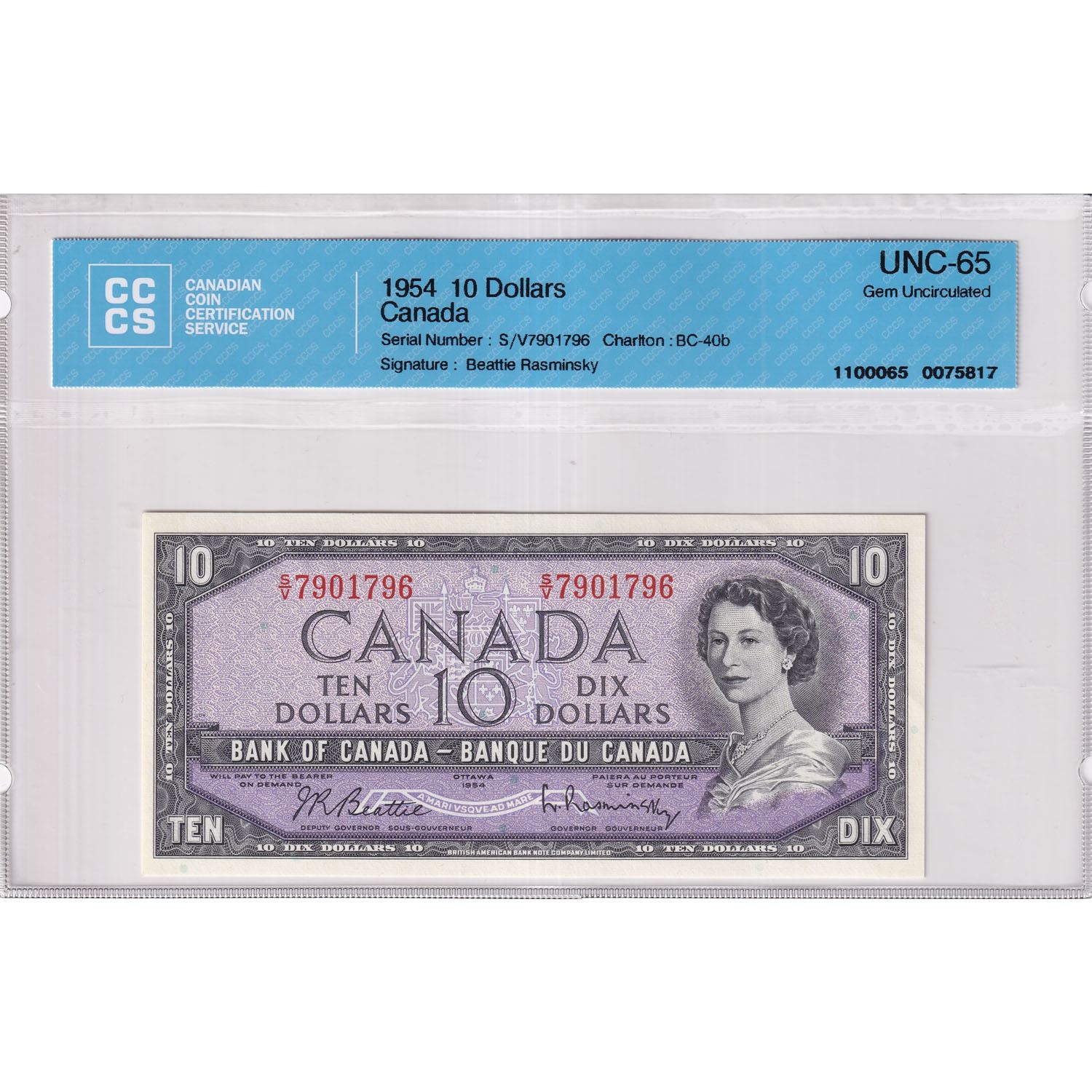 1954 $10 BC-40b, Bank of Canada, Beattie-Rasminsky, Modified Portrait, S/N: S/V7901796, CCCS Certified GUNC-65.