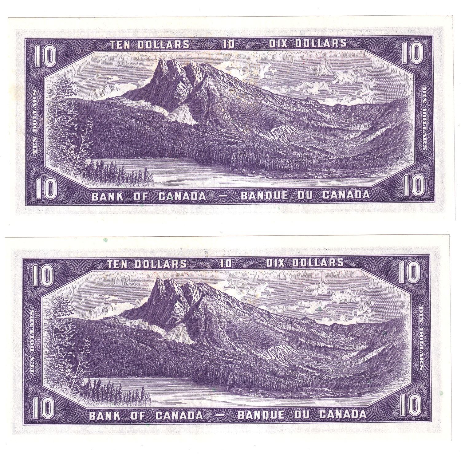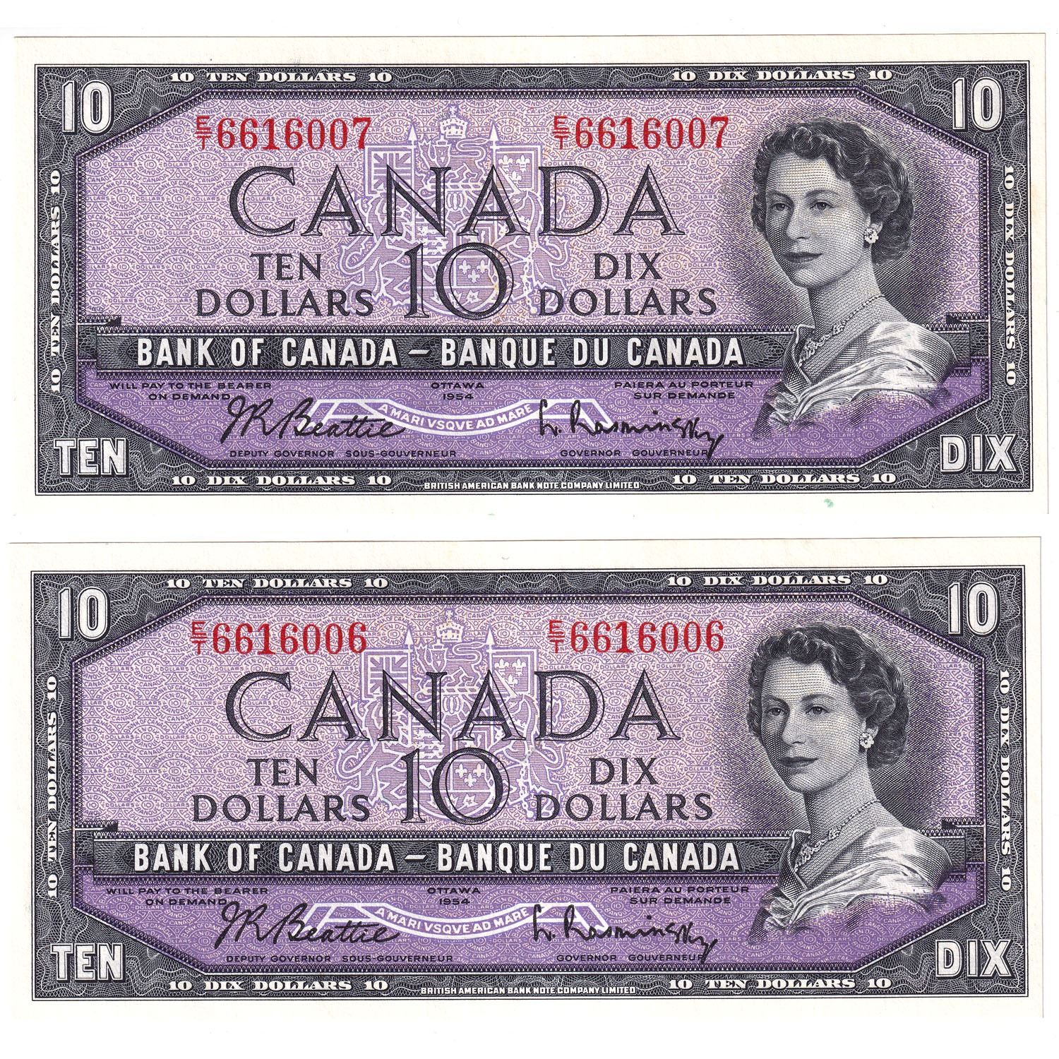 1954 $10 BC-40b Bank of Canada Notes Beattie-Rasminsky Signatures with Consecutive Serial Numbers E/T6616006-007 UNC. 2pcs