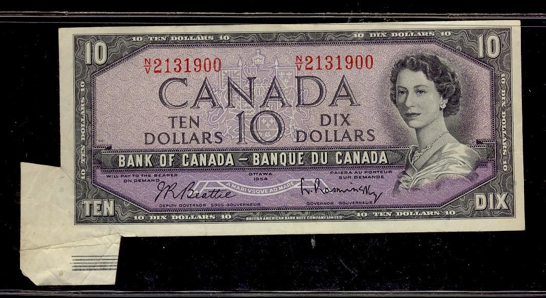 1954 $10 BC-40b ERROR note, #NV2131900. Butterfly cut note, with remaining piece attached at bottom left corner. VF. Should be viewed.