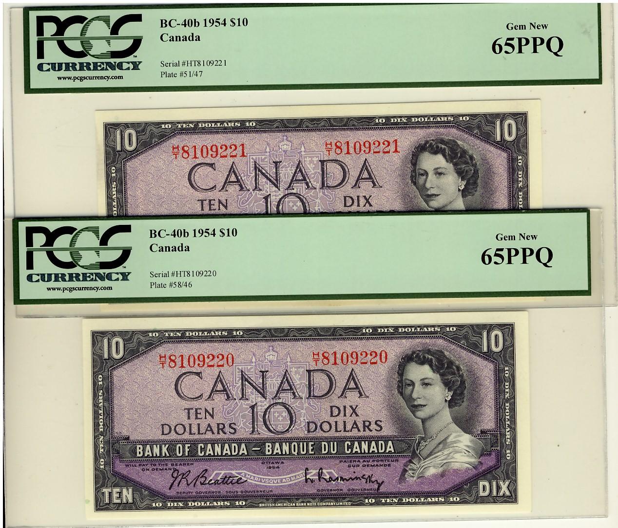 1954 $10 BC-40b #HT8109220/221 PCGS Gem UNC65 PPQ. Lot of 2 consecutive notes.