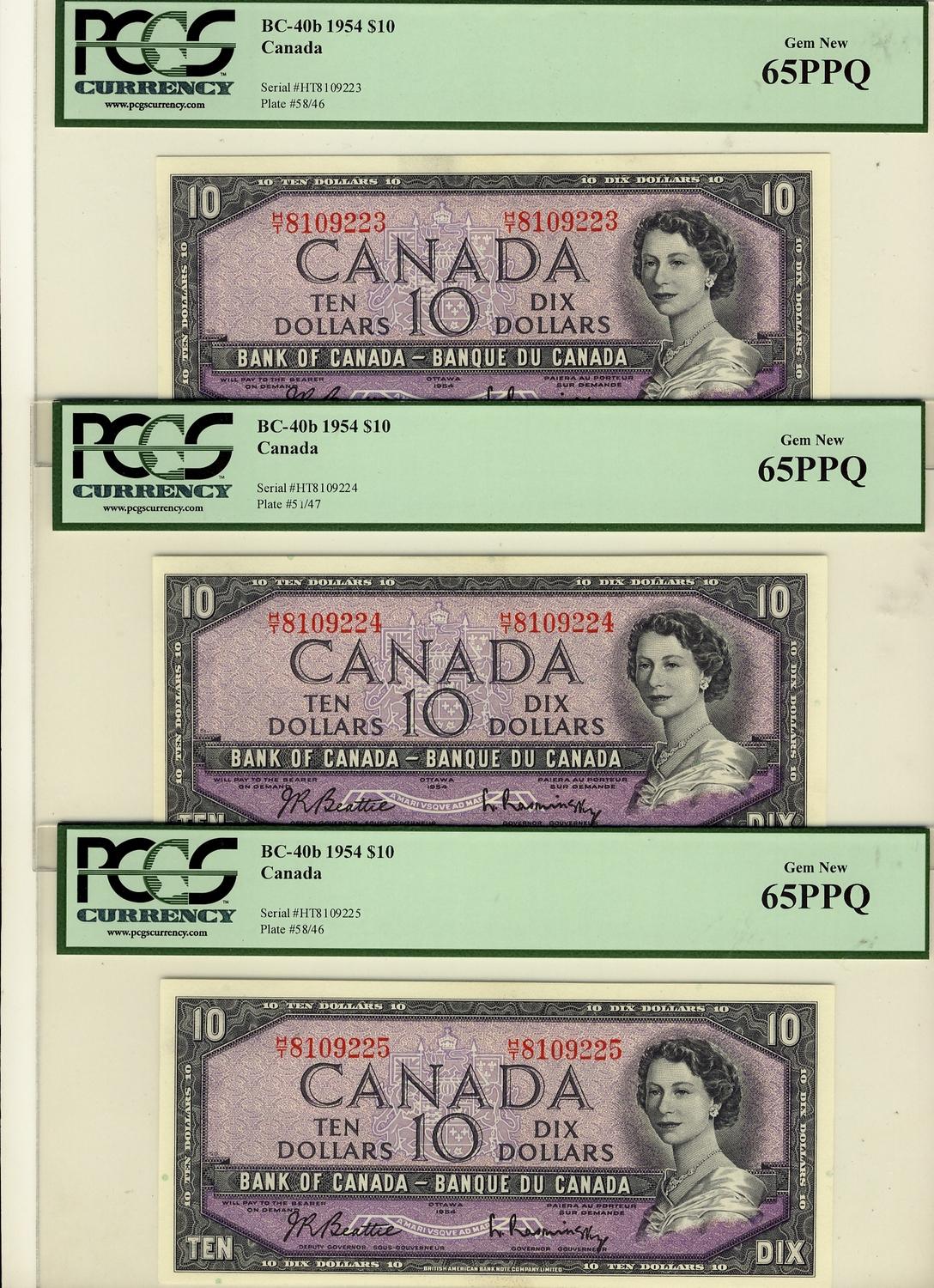 1954 $10 BC-40b #HT8109223-225 PCGS Gem UNC65PPQ. Lot of 3 consecutive notes.